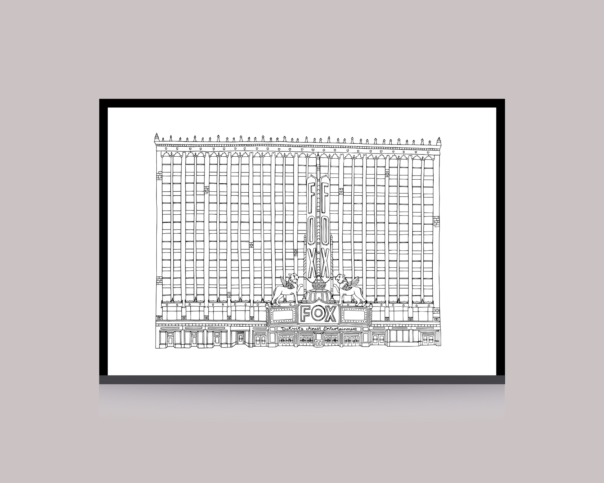 Celebrate Detroit's iconic Fox Theatre with this freehand illustration turned digital print! The hand-drawn illustration captures the charm and beauty of the almost 100 year old building in the heart of the city. Printed on enhanced matte paper for all of you theatre lovers! Frame not included.