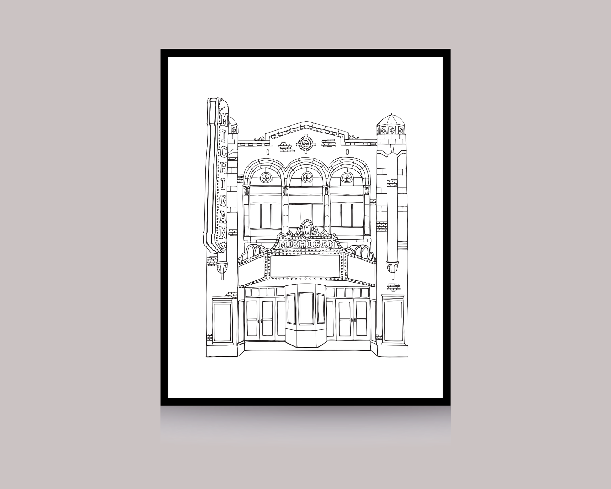 Experience the charm of downtown Ann Arbor with our hand-drawn illustration of the iconic Michigan Theatre. Perfect for any art lover or city enthusiast. Printed on enhanced matte paper and available in three different sizes! Frame not included.