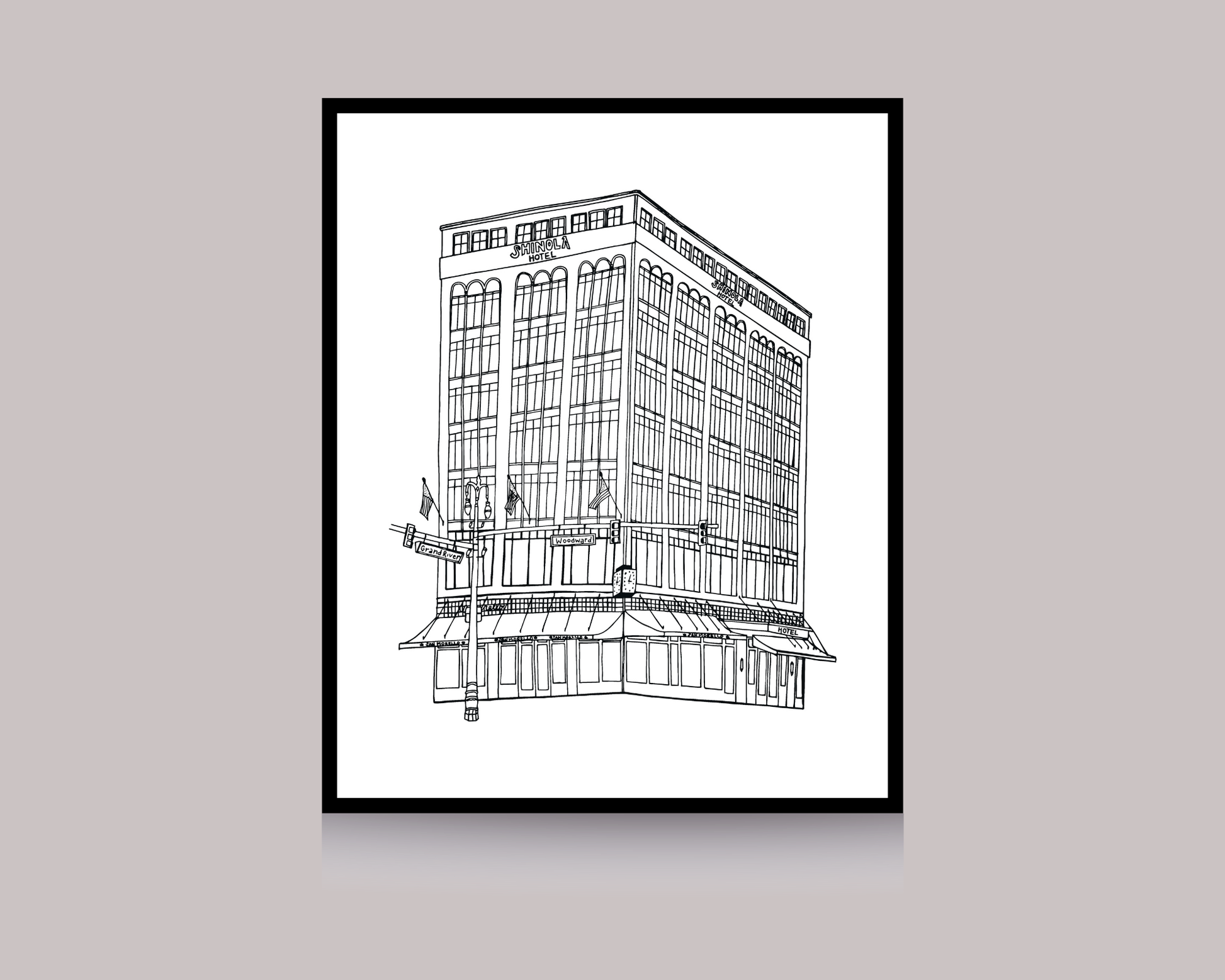 The Shinola Hotel is vibrant and chic! With high quality digital printing, the freehand illustration brings the hotel to life in detail. Printed on enhanced matte paper. Frame not included.